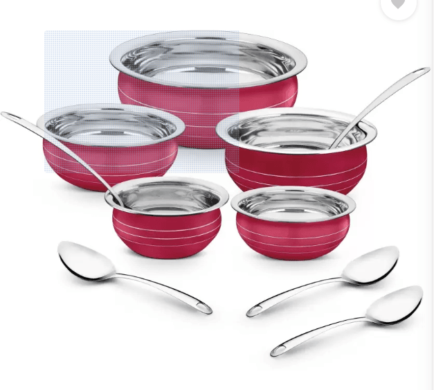 Classic Essentials by Classic Essentials Red Coloured Handi/patila/bhagona/biryani cook & serve Induction Bottom Cookware Set (Stainless Steel, 10 – Piece)